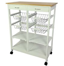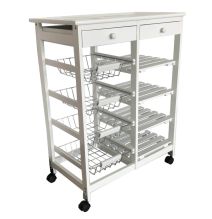 La movilidad es otro punto fuerte de este carro de cocina. Equipado con cuatro ruedas giratorias, dos de las cuales cuentan con freno, el carro se desplaza con facilidad, permitiendo utilizarlo como una camarera auxiliar durante la preparación de alimentos o servir comidas. Además, su diseño incluye tres cestas metálicas y un cajón para accesorios, ofreciendo múltiples opciones de almacenamiento que facilitan la organización de utensilios, ingredientes y otros elementos esenciales de la cocina.